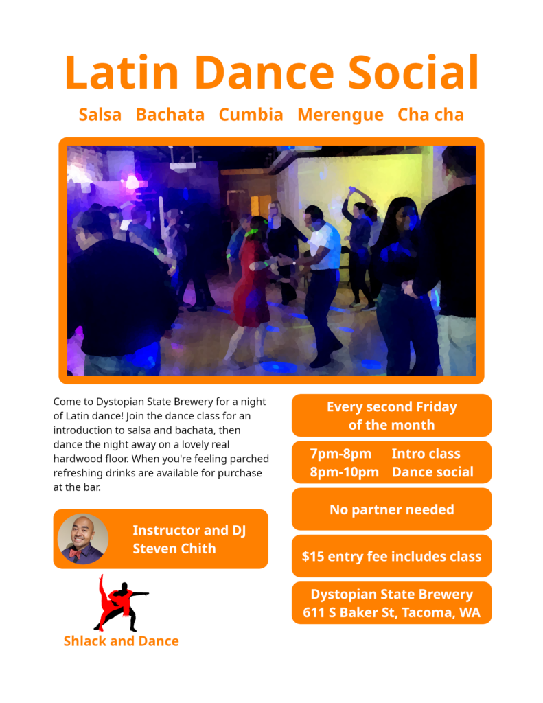 Learn to dance ballroom, Latin, swing, and more here at Shlack and Dance in Tacoma, WA! Open to all ages and skill levels. Partner not required. Build confidence, improve coordination and health, and find community.